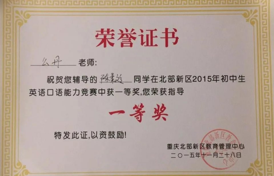 2015年指导学生在北部新区初中生口语能力竞赛中,获得四个指导一等奖两个二等奖。2016年在两江新区首届初中英语教师基本功大赛微课比赛中荣获二等奖,