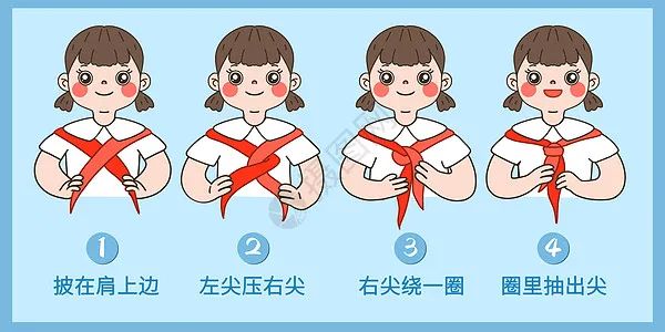 红领巾佩戴口诀:立衣领,折领巾,领巾披在肩,左尖压右尖,底尖转一圈,(即右尖绕一圈),圈里抽出尖,压衣领。