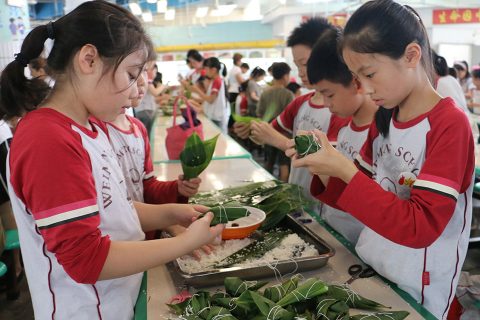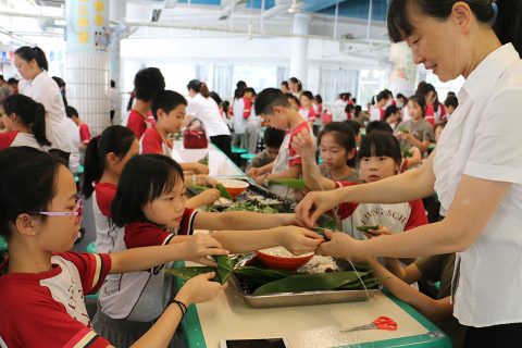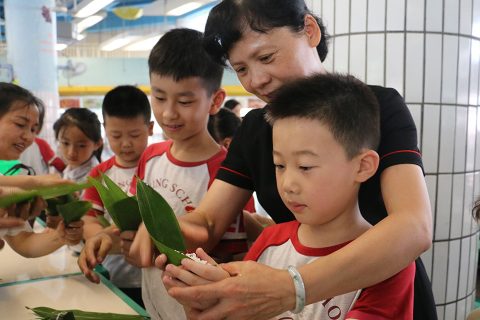 最后在老师和叔叔阿姨们的耐心指导和示范下,大部分学生学会了包粽子。一片片清香的粽叶、一粒粒晶莹的糯米,在一双双小手下变成了一个个可爱的粽子。