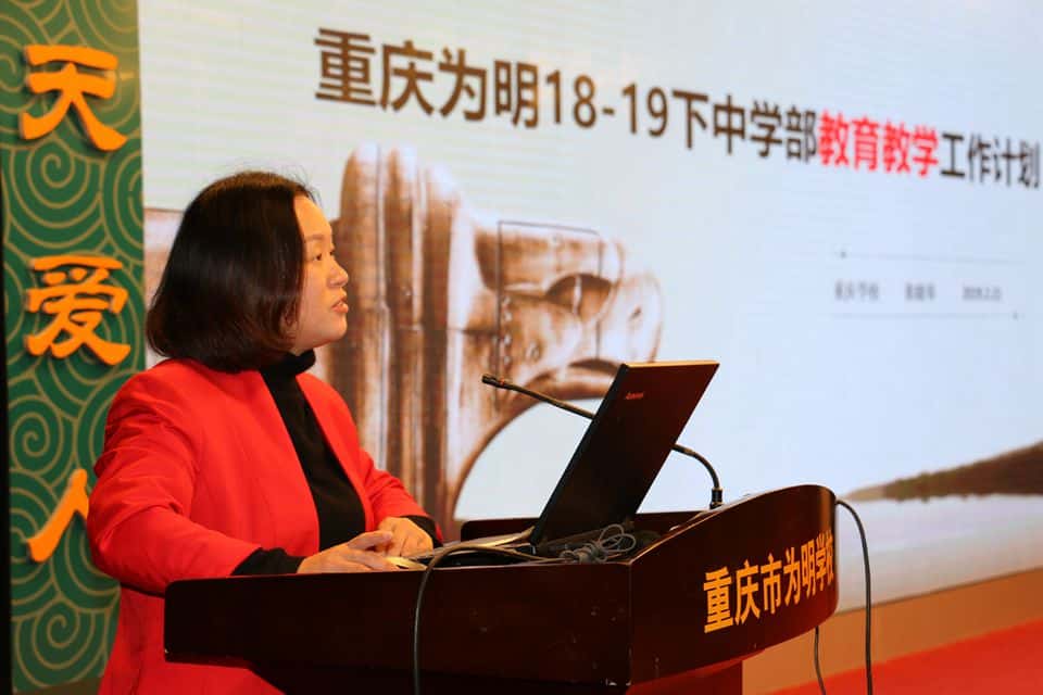 中学部教学主任文伊莲代表业务副校长张晓琴宣讲了中学业务工作计划,从“课堂深耕 提升质效”、“常规管理 人事并举”、“科研先导 以研促教”等八个方面,对中学部新学期的工作,做了细致的规划与安排。