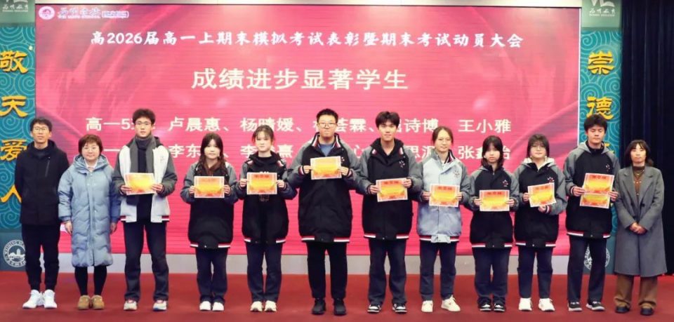 1月10日晚,距离期末考试还有4天时间,高一年级全体师生在学术报告厅举行了期末模拟考试表彰暨期末考试动员大会,表彰在模拟考试中取得显著进步的同学,激励同学们冲刺期末考试。
