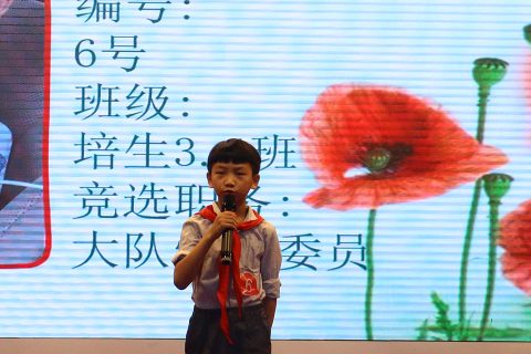 接着是三、四年级每位候选人竞选宣言和才艺表演。随后上场的是五、六年级大队委候选人,他们带来的集体展示是《阳光少年》。集体展示结束后是五、六年级候选人竞选宣言和才艺表演。