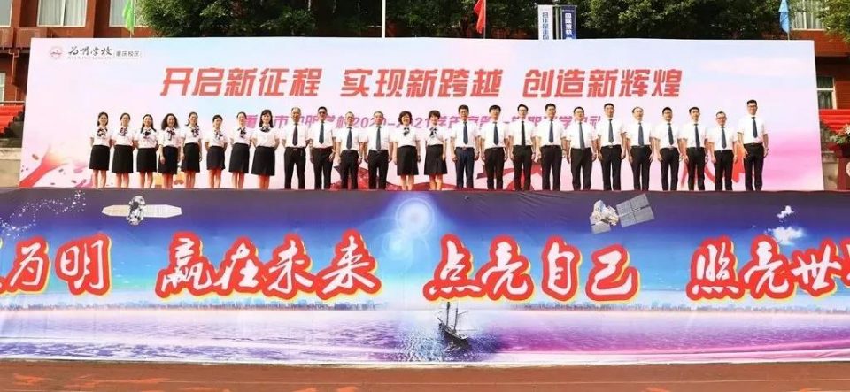 今年的开学典礼,学校领导团队,只是在主席上台亮了个相,便整齐地站到了教师学生的队伍中。因为他们想时时刻刻和老师们、学生们在一起。