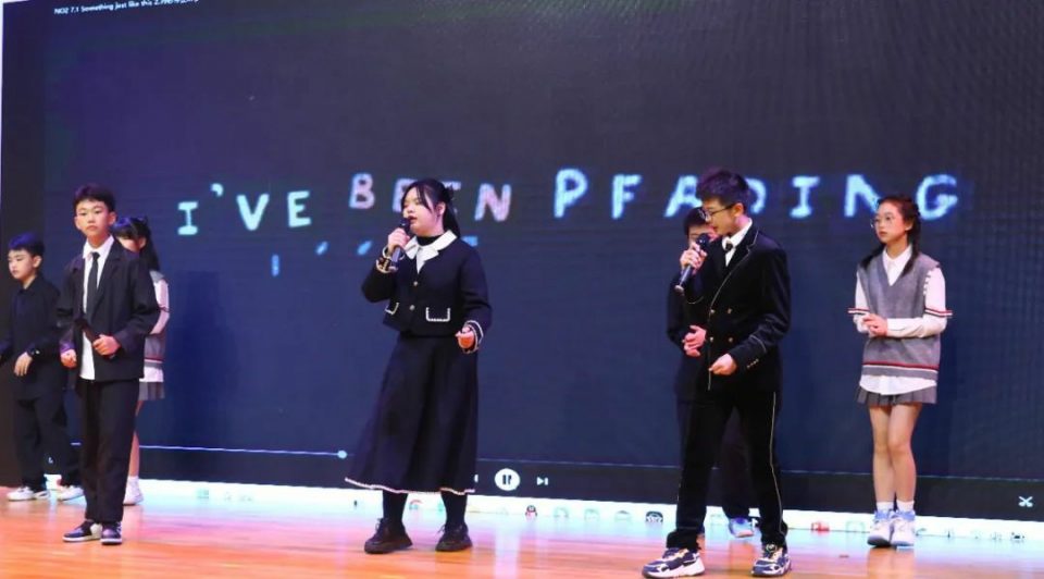 表演间隙还有非常有趣的暖场活动,比如听歌猜名,课文接龙和单词猜猜乐。这样寓教于乐的游戏既让学生体验了多元的英语学习方式,提高了学习兴趣,也锻炼了英语表达能力。