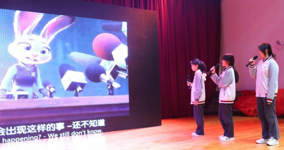 孩子们现场为迪士尼动画进行英文配音表演,这既考验同学们的英语口语基本功,又考验同学们能否快速把握到配音角色的语言特色,需要同学们一次次在排练中去揣摩角色的情感变化。