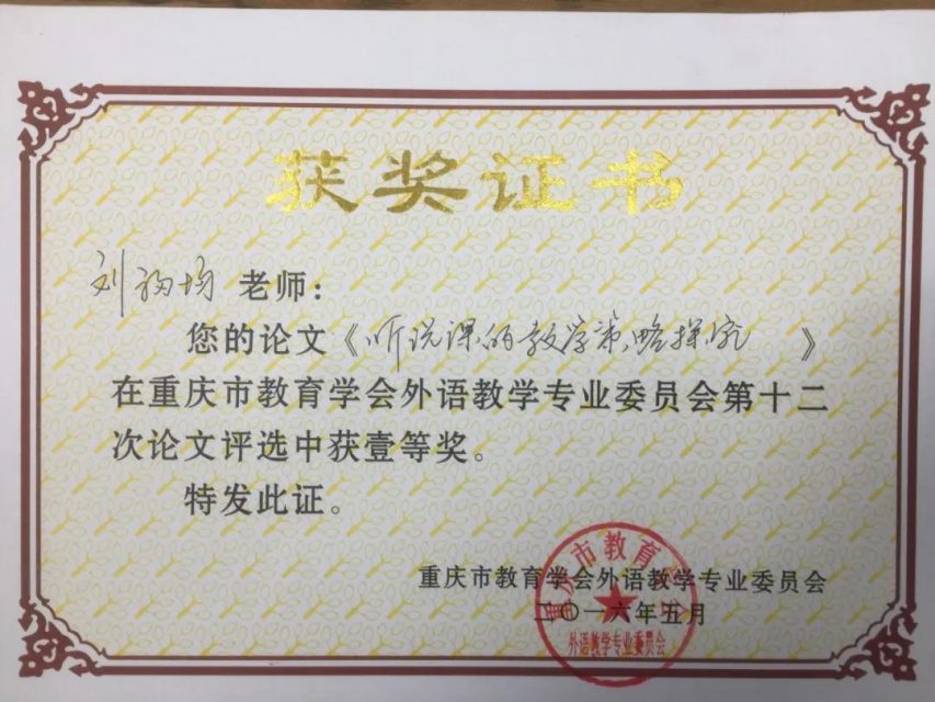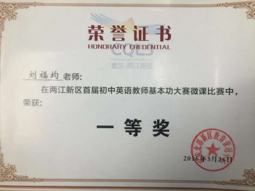获得两江新区微课大赛一等奖、英语教师基本功大赛一等奖;