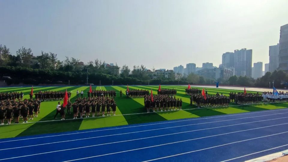 党委书记、校长王小鹏,党委副书记、副校长冉启兵,副校长樊梦及初中、高中部分干部,为各班授旗,王校长宣布新生军训正式开训。