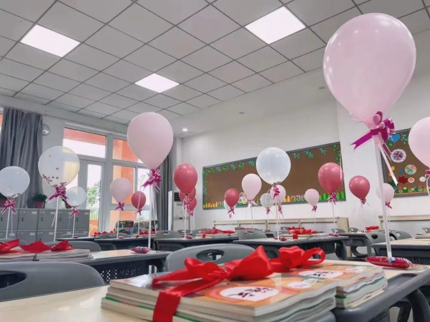 初一的新生走进教室,欣喜地看到了每个课桌上都有一只气球在向他们招手,教材也用红绳扎得整整齐齐!老师们热情地欢迎、亲切地问候、幸福瞬间把学生的心房充满。