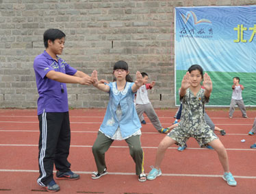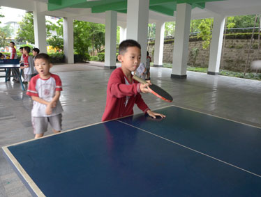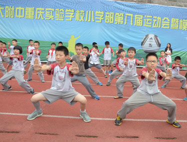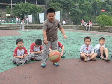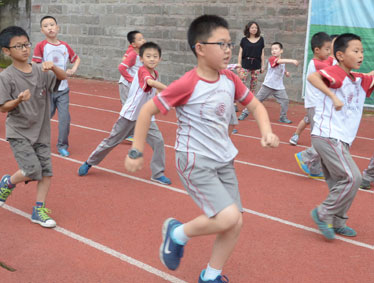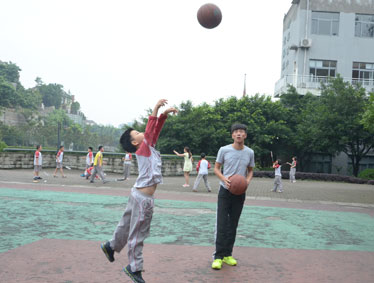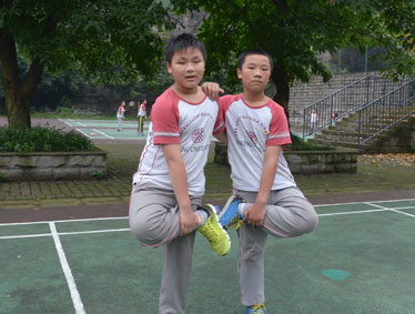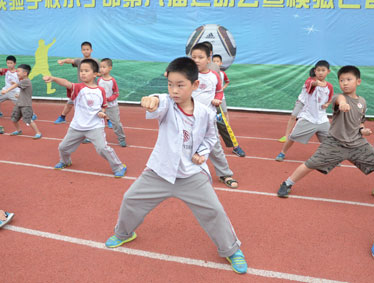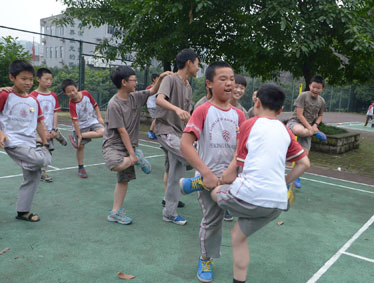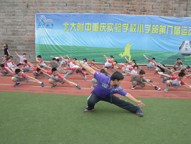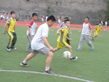 移步绿茵场,这里更是热闹非凡!有足球队,羽毛球队,篮球队,武术队,乒乓球小组,自行车小组等兴趣小组活动的身影。只见老师们俨然体坛教练,认真教授着对抗技巧,有的孩子正在认真地进行传球、运球、拍球训练,有的正在进行着激烈的比赛。一阵棍棒声伴随着激昂的音乐,老师们看到了训练有素的武术队投入地训练着,那一招一式整齐划一,棍棒随着音乐起伏,时而点地;时而指向天空;时而收紧紧贴身侧;时而金鸡独立棍棒向前。孩子们在活动中挥洒着汗水,收获的却是满满的快乐。