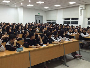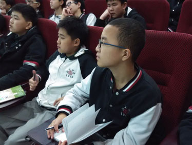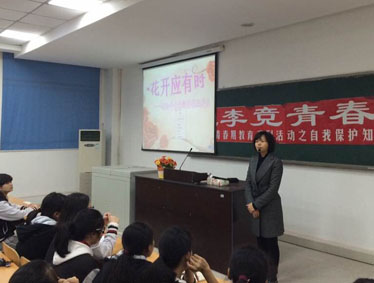11月17日周一晚6:50,在初中部的阶梯教室里,德育主任彭永正在为初二女生开展 “花开应有时——与初中女生谈青春期成长”的教育讲座。