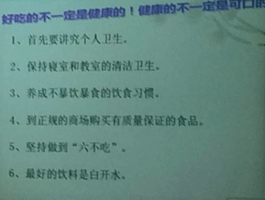 接着,蒋老师话锋一转,以“怎样才能让健康伴我们成长呢?”为话题,将食品质量安全和绿色食品标志教于孩子,让其学会在生活中关注食品的挑选。另外蒋老师还告诫孩子要养成良好的个人卫生习惯,要养成饭前便后洗手的好习惯,预防一些传染病和肠道寄生虫的传播。还需要保持寝室和教室的清洁卫生,养成爱护环境卫生的好习惯,预防细菌的滋生。教育孩子们到正规的商场购买有质量保证的食品,做到不买食品包装不全的“三无”产品。坚持做到“六不吃”:不吃生冷食物,不吃不洁瓜果、不吃腐败变质食物、不吃未经高温处理的饭菜、不喝生水、不吃“三无”小零食。为了更好的普及学生食品安全知识,蒋老师又列举出了十大安全食品:豆类食品、十字花科蔬菜、牛奶、海鱼等孩子们看的津津有味,听的兴致高昂。当蒋老师再次出示我校营养配餐时,只听孩子们在下面发自内心的感叹道:“还是我们北大附中学校好,伙食安全又营养!”伴随孩子的童真童语,蒋老师以“小学生食品安全知识问答竞赛”将本次论坛推上了高潮,孩子们一个个高高扬起手,翘首以盼,争先恐后地抢着回答问题,那专注、积极、自信的神情无不展示着本次附中论坛自己满满的收获!