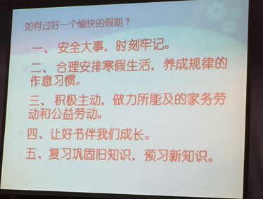 苏主任进一步强调,假期中学生要合理安排作息时间,增强体质。养成良好的学习习惯,积极完成寒假作业的同时,多角度获取知识,多读报、多看书、多实践、多与家长和同学交流。认真完成学校布置的假期作业。