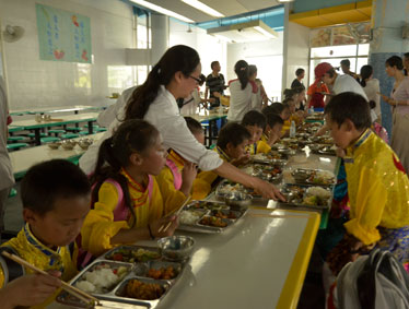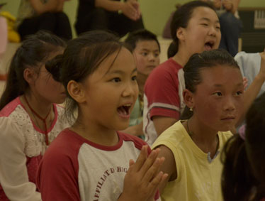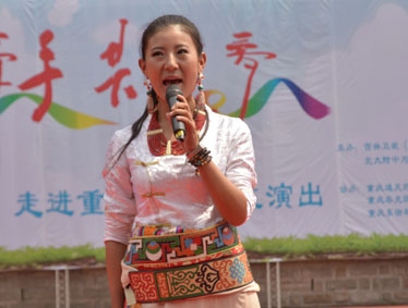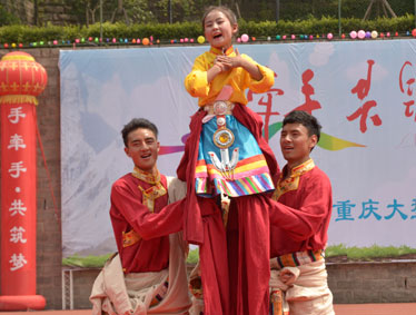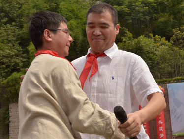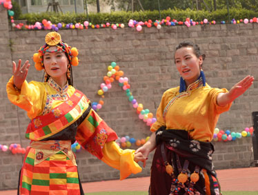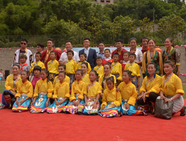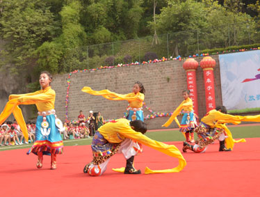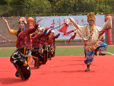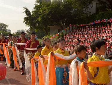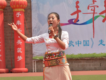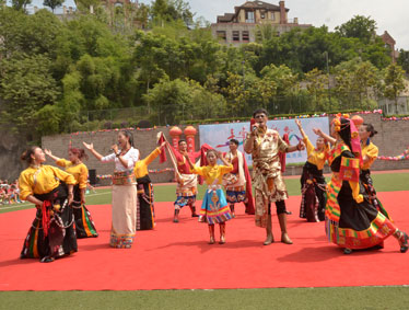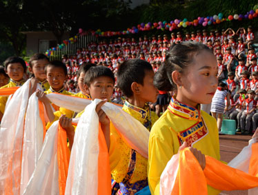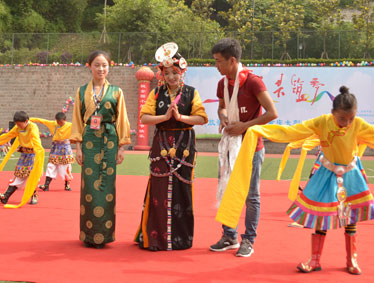 他的话深深地触动了我们在座的老师,长时间爆发出热烈的掌声,是对长期给予孩子们帮助的他的敬意,孩子们也被他真诚的话语所感动。那一群来自川藏地区的孩子,带着对他的喜爱,围在他的身边,载歌载舞,跳起了来自雪域高原的优美舞蹈,并为他献上洁白的哈达,表达了雪山儿女对这一位最尊贵的客人的崇高礼赞。