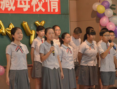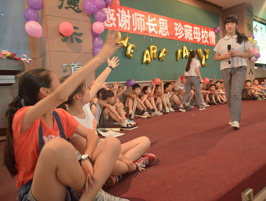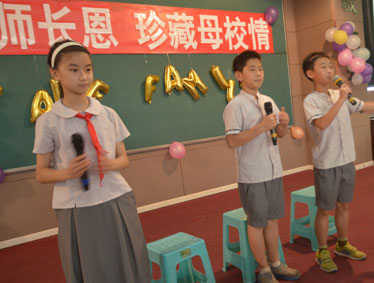 在主持人的号召下,孩子们纷纷起立鼓掌请出了所有教过这届毕业班的老师们上台,因为孩子要把感恩和感谢化作鲜花和拥抱送给老师们。孩子们还特意为母校赠送了象征平安吉祥的泰山石,祝愿母校和老师发展壮大、安康。感动的场景感染着所有到会的嘉宾和家长们。北大附中为明重庆实验学校是我们成长的乐园,这里,我们可以学知识、学文化、学道理;这里,我们可以成长为有中国灵魂和世界眼光的现代人。对于母校的培养,难说感谢,更难说再见!主持人还采访了谭婷老师,谭老师代表毕业老师们为孩子送祝福,恭喜孩子们毕业。