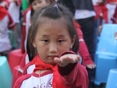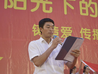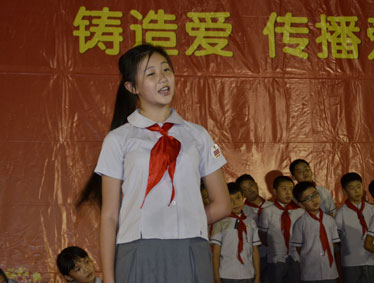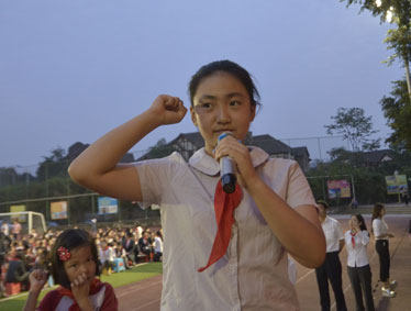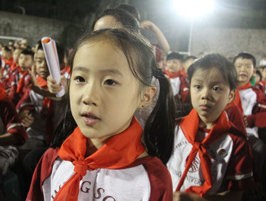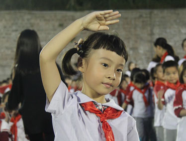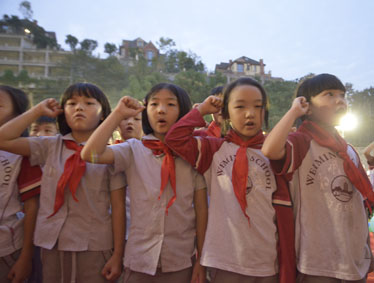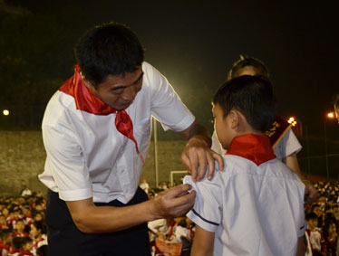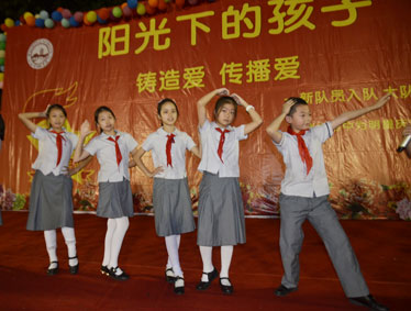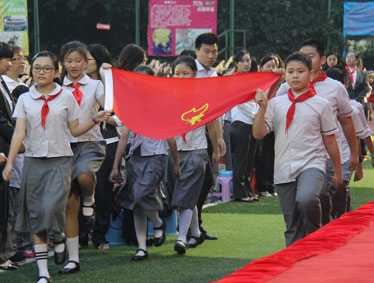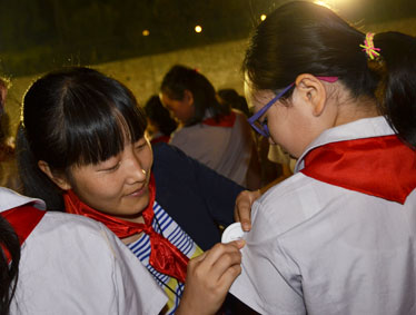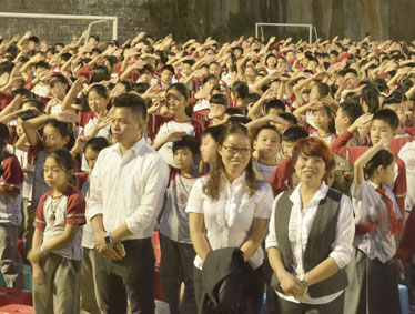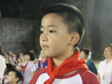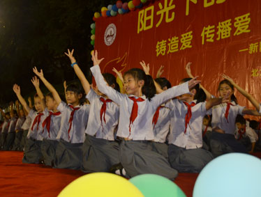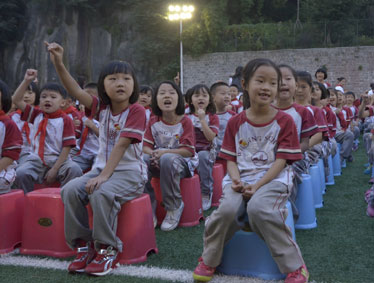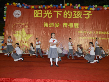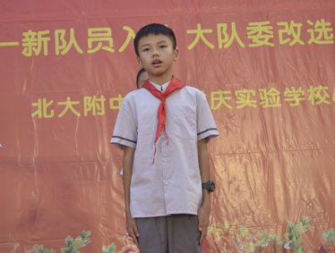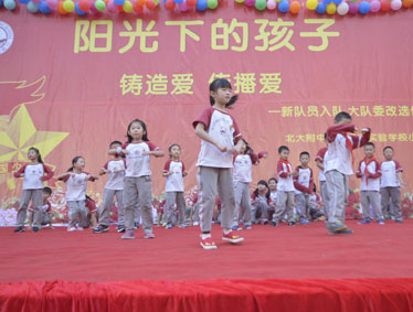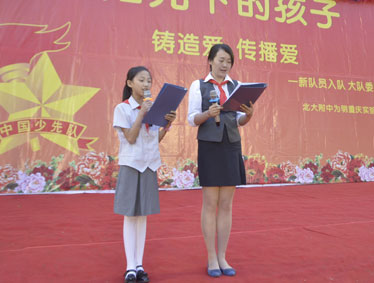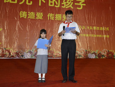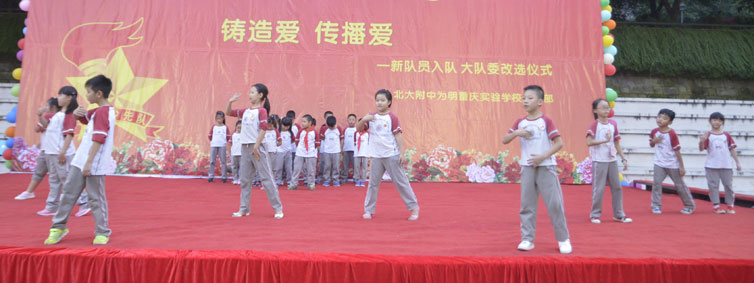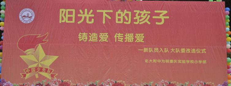 2015年10月12日晚上6:00,北大附中为明重庆学校小学部的操场上热闹非凡,孩子们的脸上都洋溢着幸福的笑容,因为今晚在这里举行以“阳光下的孩子—铸造爱,传播爱”为主题的新队员入队和大队委的改选仪式。