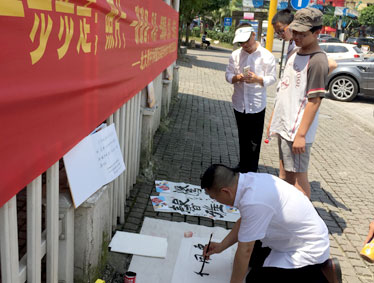 接着,师生们又向游客进行采访和宣传。刘永春、李现卫、王娟、张友桂等老师热情地向游客和商家宣传:环保留住美丽,文明高雅气质。夏有泉老师擅长书法,扯起了圈子,现场书写大字:“馨雅” “惠风和畅”“腾飞”等等,吸引了不少游客,他便借机宣传环保、文明的重要性。游客们受其感染,还买他的字画留念。