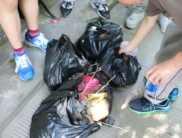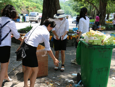 各班按照划分好的片区,进行垃圾清除和文明出游的宣传。老师们身先士卒,首先向垃圾开战。李建军、隆远鸿、覃全、汪秋等老师不畏脏、不怕累,弯腰把地上的垃圾捡起来、拔起来,汗水湿透了衣襟……同学们也跟着搜寻地上的垃圾拾起丢进垃圾箱中。忙了两个小时,同学们把洋人街上的垃圾都清理干净了,再也看不到烟头、竹签等物了。大家都很高兴,洗干净小手,笑容从心底绽放出来,真甜!