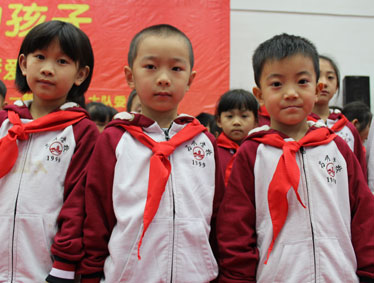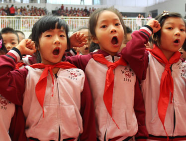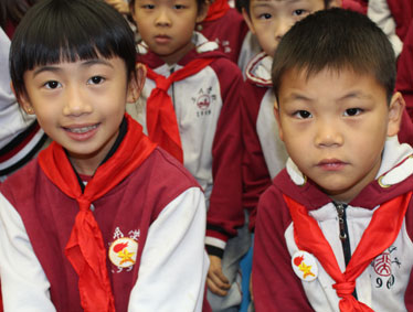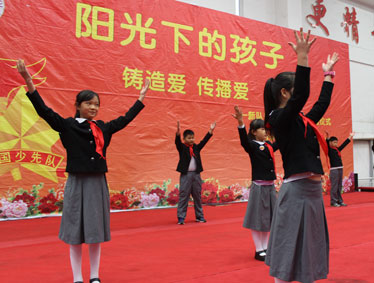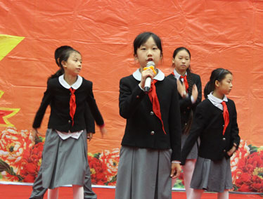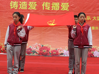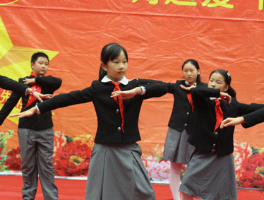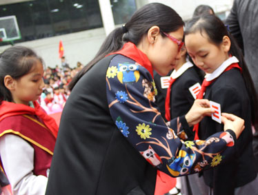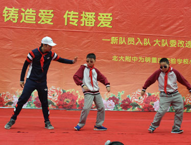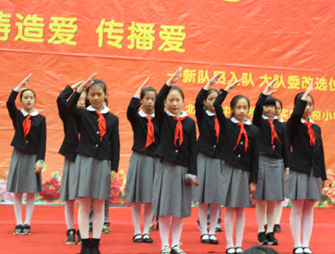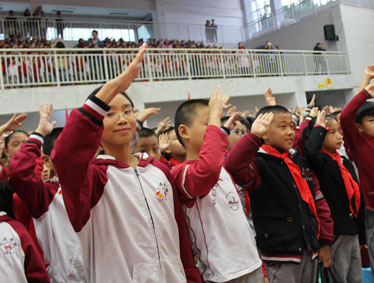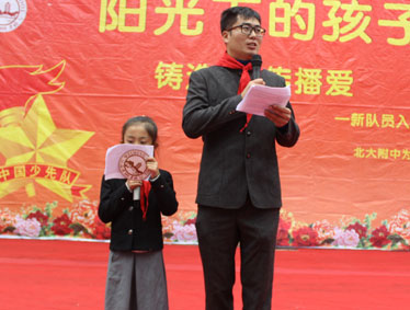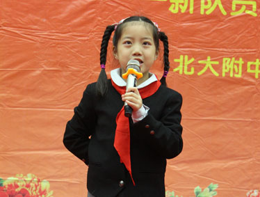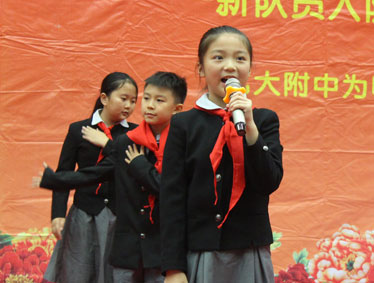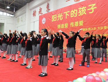 2016年10月12日下午4:15分, 北大附中为明重庆学校小学部在体育馆里举行了 “阳光下的孩子”为主题的中国少年先锋队第67个建队纪念日活动。两千多名师生一坐定,易林老师和五年级两名同学的动感舞蹈《快乐的机器人》立刻燃爆全场。他们一举手一投足认真专注,获得了掌声无数。主持人宣布活动开始,激昂的出旗曲响起,六名少先队员迈着庄重的步伐护卫队旗,来到舞台中央。队旗鲜红明亮,全场唱响《少年先锋队队歌》。“我们是共产主义接班人……”歌声如激昂的号角,吹响了少年先锋队继承革命传统的奋斗的向往,吹进了全场少年队员热血沸腾的心。一年级的孩子们个个翘首仰望,对这样庄重的仪式充满了神圣感,小小的身板挺得直直的,难言激动的表情。小学部德育处王华品主任宣布读了新队员名单,同学们都静心聆听,激动万分。当新队员们看着胸前鲜艳的红领巾时,他们的那一张张小脸笑得那么绚烂。在67中队大队长刘星静雨领誓下,新队员进行了庄严的宣誓:我是中国少年先锋队队员。我在队旗下宣誓——我决心遵照中国共产党的教导,好好学习,好好工作,好好劳动,准备着——为共产主义事业,贡献出一切力量!