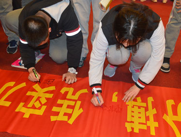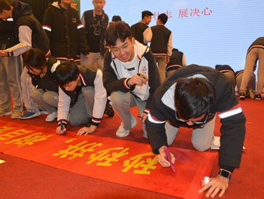 最后,各班同学们在自己的横幅上用记号笔书写自己的凌云壮志,然后进行展示。各班横幅标语如下:
