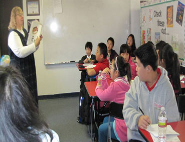 在洛杉矶的Chino Valley Christian School学校里,冬令营的孩子们都认识了很多美国同学,和蔼可亲的美国老师教大家如何使用刀叉,如何称呼别人,如何拼读单词等等。雷馨然告诉我们,美国小学生学习很轻松,每天早上八点到校,可以活动半个小时,然后开始祈祷(因为这所学校是基督教学校),接着就开始上课了,学生可以自由选择课程,令她惊讶的是,他们小学就开始学习历史了。每天12:00吃午餐,吃午餐前也要祈祷。下午两节课后就可以放学了。