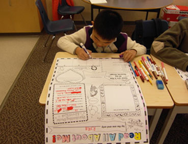 一开始MISS.C就让孩子自己做自己的海报。选自己喜欢的颜色填色,用自己会的英语表达自己,大家做得很兴奋!