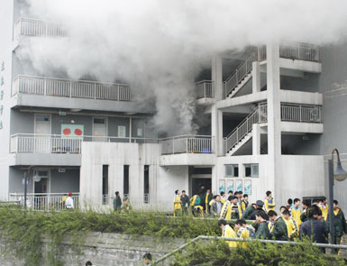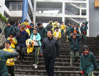 2011年3月24日,中午的校园格外宁静,学生们正在寝室中午休。13点50分,一阵急促的警铃声划破校园的宁静——“发生火灾”了。老师们第一时间跑出办公室,一部分老师立刻配合各寝室值班老师疏散各寝室学生,一部分老师熟练地按照火灾疏散路线分散开,为疏散出来的学生指引疏散目的地。很快,走读生宿舍,住读生宿舍的孩子们从宿舍疏散出来。五分钟后全校两千多名师生全部安全疏散到操场,没有一名学生受伤,没有一名学生遗漏。