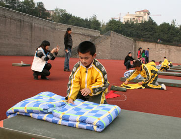 三、四年级的孩子们除了穿衣服,戴红领巾外,还要比赛叠被子。学校的育人宗旨是“培养有中国灵魂和世界眼光的现代人”,对孩子们的一生发展负责。因此,学校特别重视对孩子的习惯培养,并针对小学阶段孩子们的年龄特点制定了“八十一个好习惯”。当然,孩子们的生活习惯就是学校的重点培养计划之一。孩子们来到学校,生活班主任和高年级的哥哥姐姐们就会教会他们叠被子。并且,光会叠还不行,孩子们还会被要求将被子叠成像解放军叔叔他们的被子那样的“豆腐块”。为此,学校还多次组织孩子们到武警七支队去参观、学习。看着孩子们熟稔的动作,相信家长们和老师们的心里都是甜甜的。
