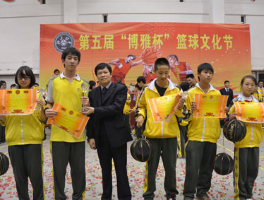 2011年11月24日晚,历时一个月的北大附中重庆实验学校“第五届博雅杯篮球文化节”在校体育馆落下帷幕。出席此次闭幕式的学校领导有:校长陈玉明、副校长刘洪彬、中学部主任刘云、校办主任陶伟、工会主席蒋涌泉、高中德育处主任苏小波,初中德育处主任栾龙。闭幕式由白雪平老师和高一四班赵依婷同学主持。