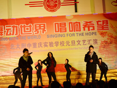 12月31日晚,北大附中重庆实验学校中学部2012年“舞动世界、唱响希望”元旦晚会在我校体育馆隆重上演。学校陈玉明校长,刘洪彬副校长,工会蒋涌泉主席,校办陶伟主任,总务于万青主任、财务黄万春主管,招办陈旭主任,人力资源部孙静主管,中学部刘云主任,德育处栾龙主任和苏晓波主任、教务处张晓琴主任与全校师生怀着对新年的美好希望,欢聚一堂,共度良宵。