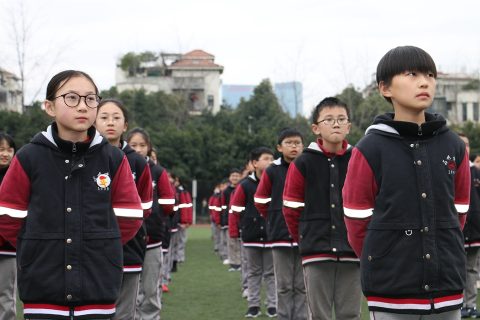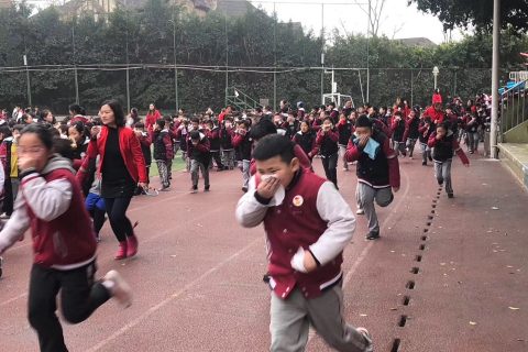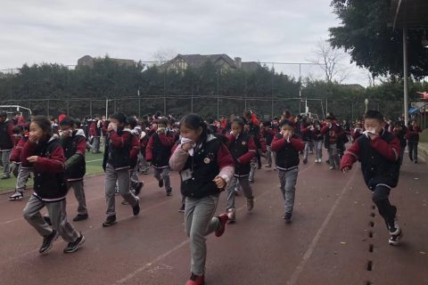 师生们弯腰,用小手绢、纸巾或手捂住口鼻,通过各教学楼的疏散路线,向安全位置撤离,小学1-5年级撤离到小学运动场,小学6年级、初高中、国际部、伯克利班撤离至中学运动场。