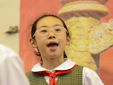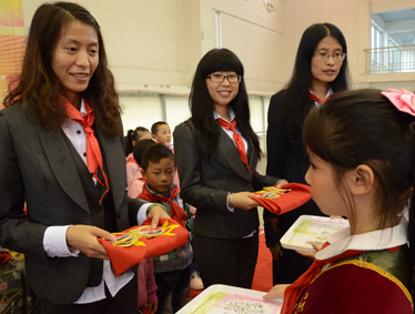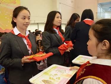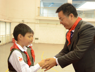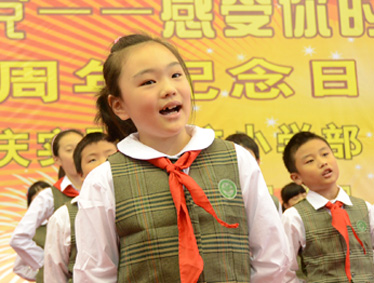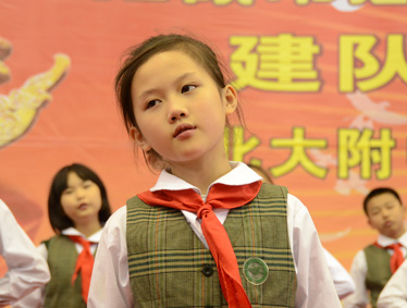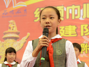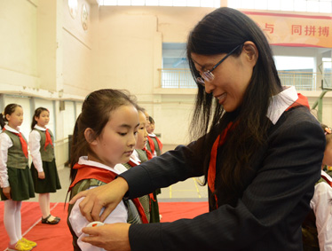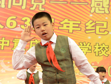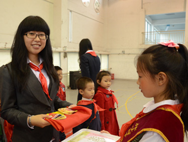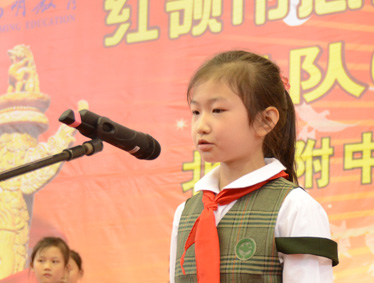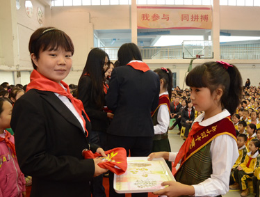 第一篇章 在爱心中成长----新队员的加入。伴随着《红领巾之歌》的旋律,一年级的小朋友戴上了鲜艳的红领巾,光荣地加入少先队。大队长邓依妮同学带领大家宣誓,使队员心灵受到熏陶,激发少先队员的光荣感和使命感。接着,三四年级大队干部向大家表演了《酸酸甜甜就是我》。