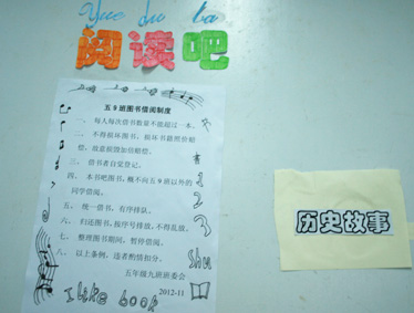 四.4班的图书角尤其让人眼前一亮。那是一个四面敞开的小柜子,放在教室左前方,上面整齐并分类放着各种书籍,有小说类、探险类、科学类等等,真是琳琅满目。在课余时间,难怪同学们都会在这个外表美观而藏书丰富的图书角前流连忘返。在柜子上方,还立着一个“管理员职责”,可以看出,班主任老师在图书角上花了不少巧妙心思,这也让同学们有章可遁,看着干净整洁的图书柜,大家都知道了那位图书管理员同学一定非常尽职尽责。