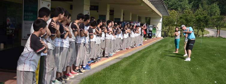 10分钟左右,车已经停在了保利高尔夫球场外。孩子们一进入球场,就受到Judy(初一汤姆森英语班 欧妍竺)和她妈妈热情的欢迎。一会,Mike教练和夫人也来了。师生又见面了,分外亲切。