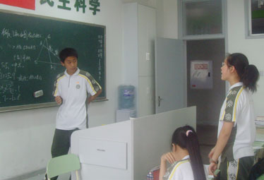 同学们讲解的思路非常清晰,语言精练,举手投足俨然一位老师的形象,比如:7.2班的许莉、余亮吟、丁秋、张禹洵、魏涛、张乃夫等同学,他们的表演异彩纷呈;许莉同学胸有成竹,慷慨陈词;余亮吟同学落落大方,娓娓道来;丁秋同学洒脱自如,有条不紊;张禹洵同学精神饱满,侃侃而谈;魏涛同学激情奔放,声若洪钟;平时很难主动开口的同学,在这些同学的积极带动下也要闪亮登场,充分表达自己的见解,比如:7.2班的陈革利,7.1班的朱丹、王海霞等,他们的表演赢得了同学们一阵阵情不自禁的热烈的掌声,让我好生“嫉妒”。