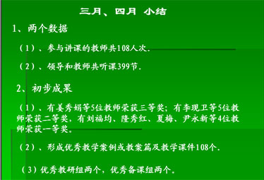 中学部刘云主任总结“三、四、五课堂教学模式”半期来实施情况,108人次参与,399节听评课,108个优秀教学案例等数字展示中学部扎实推进有效教学、努力探索教学模式初步成果。并从“三、四、五课堂教学模式”四个教学环节进行总结,举用夏梅、唐梓倬、李建军、隆秀红、尹永新、宋晓燕、李现卫、刘福均、