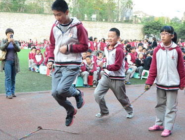 生命在于运动,运动是人类的美丽表情。跳绳比赛迎来了此次活动的又一个高潮。操场上一片欢腾的景象,只见一根根彩绳在空中挥舞着,孩子们一张张稚嫩的脸蛋洋溢着笑容,一双双明亮的眼睛闪烁着兴奋的光芒。一年级的小朋友一点都不甘示弱,一个个卯足了劲儿,小脸涨得通红,他们就像那空中跳跃的小精灵穿梭在飞扬的长绳之间。“1,2,3,4……”数数声,加油呐喊声响彻校园上空……